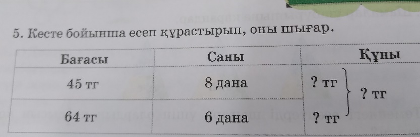 Өзіңді тексер! А) Шешуі: 45 • 8+64 • 6= 744 (тенге) Жауабы:8 дана балмұздақ 360тг, 6 дана банан 384 тг, барлығының құны 744 теңгеге тең |