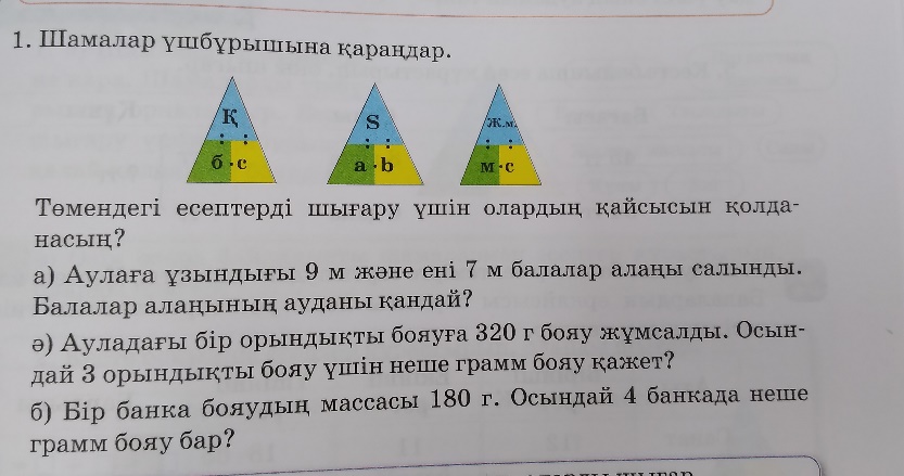 Шамалар үшбұрышындағы формулалар нені білдіреді,есімізге түсірейік 1-формула: Қ-құны Б-бір заттың бағасы С-саны -дегенді білдіреді 2-формула: S- ауданы a-ұзындығы b-ені- дегенді білдіреді 3-формула: Ж.м-жалпы масса М-бір заттың массасы С-саны - дегенді білдіреді 1-тапсырма: Берілген шамалар үшбұрышына қара,төмендегі есептерде шығару үшін олардың қайсысын қолданасың,ойлан! Өзіңді тексер! А) 2-формуланы қолданамыз