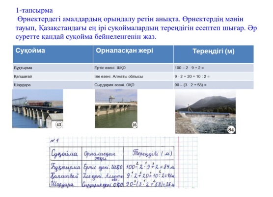Қазақстан аумағында ірілі-ұсақты 85 мың өзен бар. Мысалы өзіміздің Есіл өзенінің ұзындығы 2450 км болса Ал Нұра өзені 978 км. Бүгін сіздермен Суқоймалардың орналасқан жері мен тереңдігін есептеп табайық. |