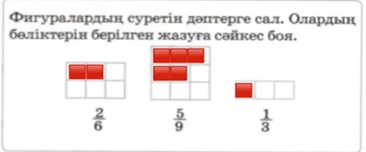 3.1.1.6 жай бөлшектерді оқу, жазу; бөлімдері бірдей жай бөлшектерді көрнекілік қолдану арқылы салыстыру |
