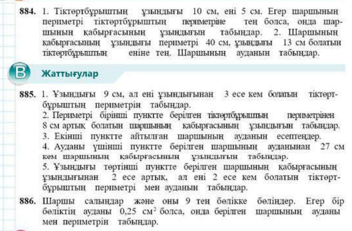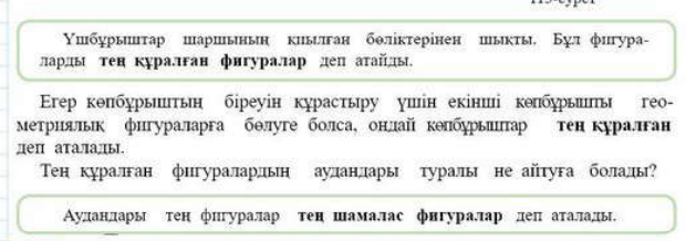 Барлық оқушылар үшін: Білім алушылар бірлесіп, фигураларды қию және құрастыру арқылы берілген есептермен танысады. Көпшілік оқушылар үшін: Білім алушылар фигураларды қию және құрастыру арқылы берілген есептерді шығарады. Кейбір оқушылар үшін: Білім алушылар фигураларды қияды және құрастырады. |