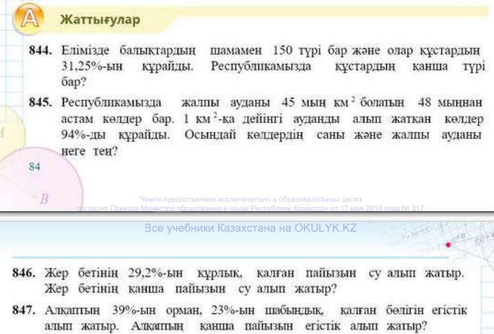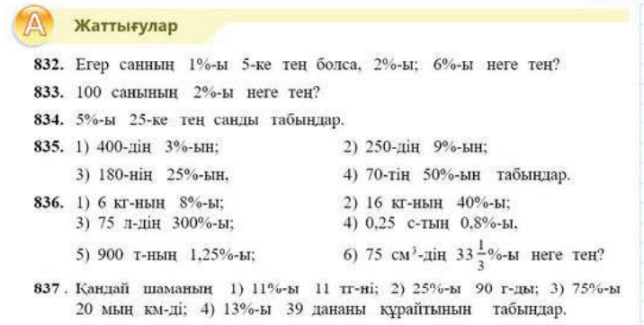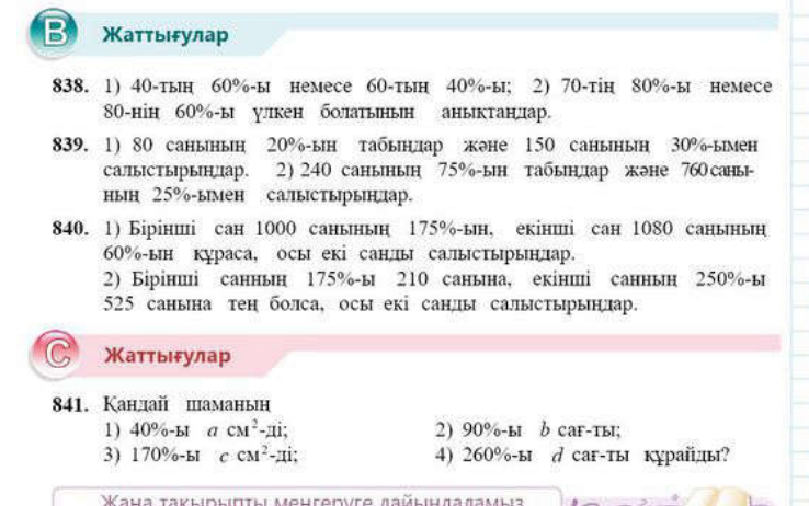 Барлық оқушылар үшін: Білім алушылар бірлесіп, пайыздық есептермен танысады. Көпшілік оқушылар үшін: Білім алушылар пайыздық есептердің С нұсқасын шығарады. Кейбір оқушылар үшін: Білім алушылар пайыздық есептердің шығарылуын сипаттап бере алады. |
