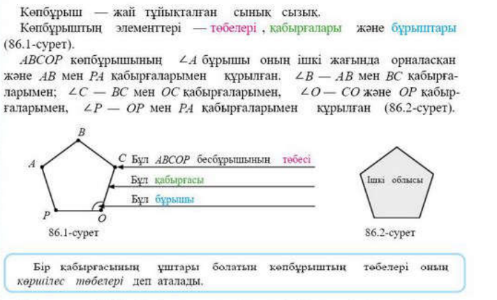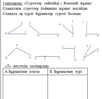 (Ұ) «Миға шабуыл» әдісі арқылы өткен тақырыппен жаңа сабақты байланыстыру мақсатында ой қозғау сұрақтарын ұжымдық талқылау. Оқушыларға жалпылама төмендегі сұрақтар және жаттығу түрлері беріледі. Сұрақтар: 1.Көпбұрыштар ұғымын білдік пе? 2.Көпбұрыштарға мысал келтір. 3.Көпбұрыштардың градустық өлшемдерін қалай анықтайды? |