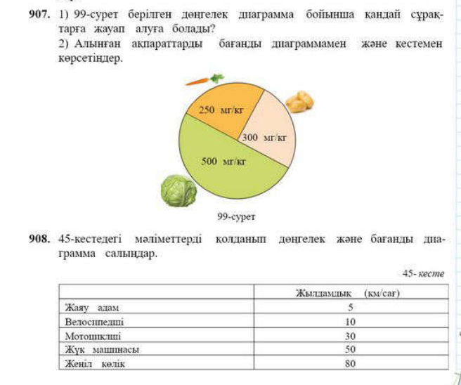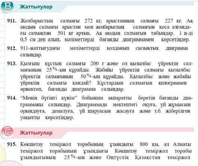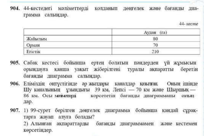 Барлық оқушылар үшін: Білім алушылар бірлесіп, кесте мен диаграммалар түрінде берілген ақпаратты есептермен танысады. Көпшілік оқушылар үшін: Білім алушылар диаграммаларға арналған есептерді шығарады. Кейбір оқушылар үшін: Білім алушылар диаграммаларға арналған есептердің шығарылуын сипаттап бере алады. |