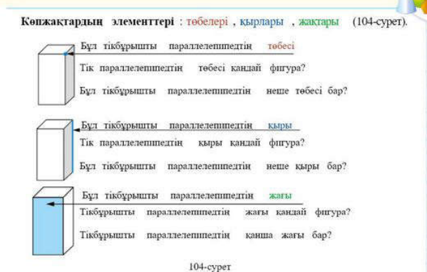 (Ұ) «Миға шабуыл» әдісі арқылы өткен тақырыппен жаңа сабақты байланыстыру мақсатында ой қозғау сұрақтарын ұжымдық талқылау. Оқушыларға жалпылама төмендегі сұрақтар және жаттығу түрлері беріледі. Сұрақтар: 1.Өзіңді қоршаған ортадан тік бұрышты параллелепипедке мысал келтіріңдер. 2.Тік бұрышты параллелепипедтің неше қыры, неше төбесі, неше жағы бар? |