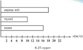 2 8.27-суретте аңшы иттің, түлкінің және қоянның жылдамдықтарының бағанды диаграммасы берілген. Түлкінің жылдамдығы көп пе, әлде қоянның жылдамдығы көп пе? |
