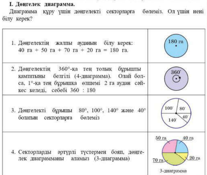 Барлық оқушылар үшін: Білім алушылар шеңбер, дөңгелек ұғымдарын меңгереді. Көпшілік оқушылар үшін: Білім алушылар диаграммаларға арналған есептерді шығарады. Кейбір оқушылар үшін: Білім алушылар шеңбер, дөңгелекке арналған есептердің шығарылуын сипаттап бере алады. |