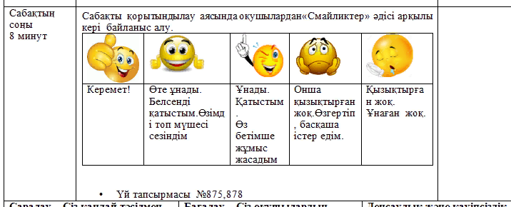 «Еркін микрофон» әдісі. Мұғалім сабақты қорытындылау мақсатында оқушылардың сабаққа деген көзқарасын, рефлексиясын тыңдайды. Мақсаты: Оқушы алған білімін саралай білуге дағдыланады. Тиімділігі: Тақырып бойынша оқушылардың пікірін анықтайды. Жинақталған деректердің құнды болуын қадағалайды. Саралау: Бұл кезеңде саралаудың «Қорытынды» тәсілі көрінеді. Үйге тапсырма: №1273 есеп. |