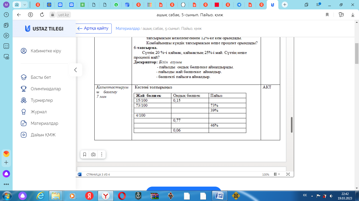 3-тапсырма. Сүттің 20 %–і қаймақ, қаймақтың 25%-і май. Сүттің неше проценті май? Дескриптор: Білім алушы - пайызды ондық бөлшекке айналдырады. - пайызды жай бөлшекке айналдыр . - бөлшекті пайызға айналдыр. |