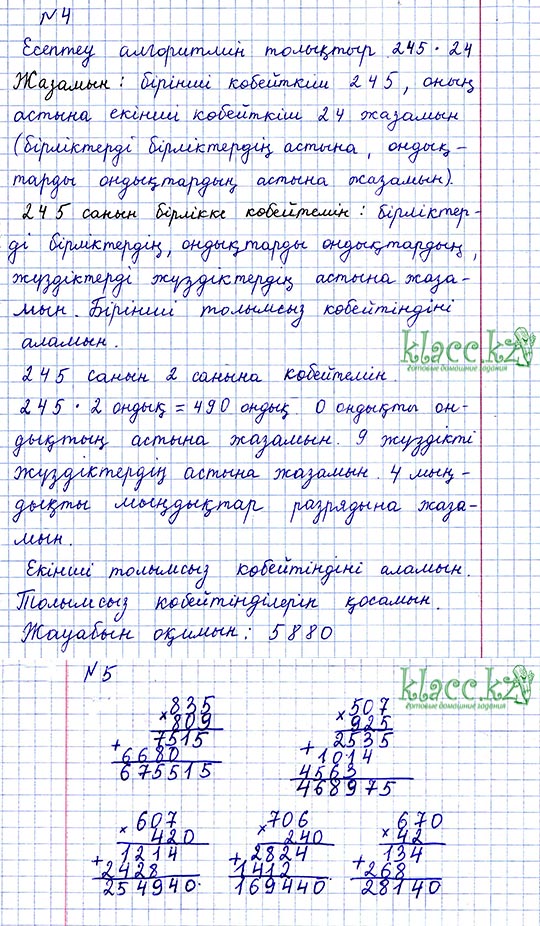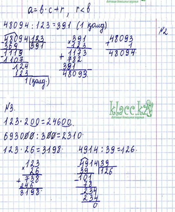 4.1.2.12 Нөлмен аяқталатын көптаңбалы сандарды үштаңбалы санға жазбаша көбейту және бөлу алгоритмін қолдану 4.1.2.13 Бөлінді мәнінде нөлдер болатын жағдайда көптаңбалы санды екітаңбалы/үштаңбалы санға бөлу алгоритмін және кері амал алгоритмінқолдану 4.2.1.8 Қалдықпен бөлу формуласын (a=b•c+r) шығарып алу және қолдану |