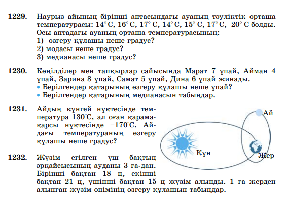 бірнеше сандардың арифметикалық ортасы, санды деректердің құлашы, медианасы, модасының анықтамаларын біледі статистикалық санды сипаттамаларды есептейді |