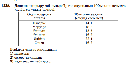Дескриптор: -формуланы тұжырымдайды; Сандарқатарының медианасын табады Бағалау: әрбір есеп бір балл Жалпы. 3 балл |