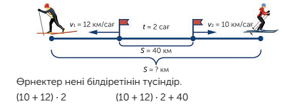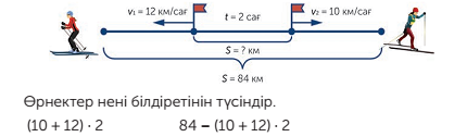 V=10км/сағ V=12км/сағ t=2сағ S=40км Sқаш=?км Ш: S1=10*2=20 км-бір шаңғышының жолы S2=12*2=24км -екінші шаңғышының жолы Sортақ= S1+ S2=20+24=44км -ортақ жол Sқаш= Sортақ+S=44+40=84км -шаңғышылар арақашықтығы Өрнектер: (10+12)*2=44км-екі шаңғышының ортақ жолы (10+12)*2+40=84км- екі шаңғышының арақашықтығы Ж: Екі шаңғышының арасы 2 сағаттан кейін 84км болады. 2-топ Сызбаны қара және ол бойынша кері есеп құрастыр.