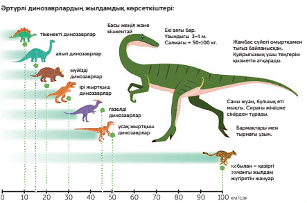 ФС 2,3-тапсырма Жұптық жұмыс "Құрастыр" әдісі ОДД:білу,түсіну,қолдану Нұсқау: Суреттегі деректермен таныс. Динозаврлардың әрқайсысы тәуліктің төрттен бір бөлігінде үздіксіз қозғалатын болса, олар қандай арақашықтықты жүріп өтеді?