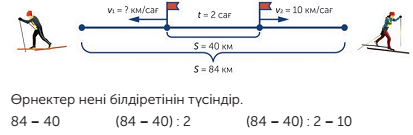 Кездесу қозғалысына, қарама-қарсы бағыттағы қозғалысқа берілген есептерді арифметикалық және алгебралық әдіспен шешеді |