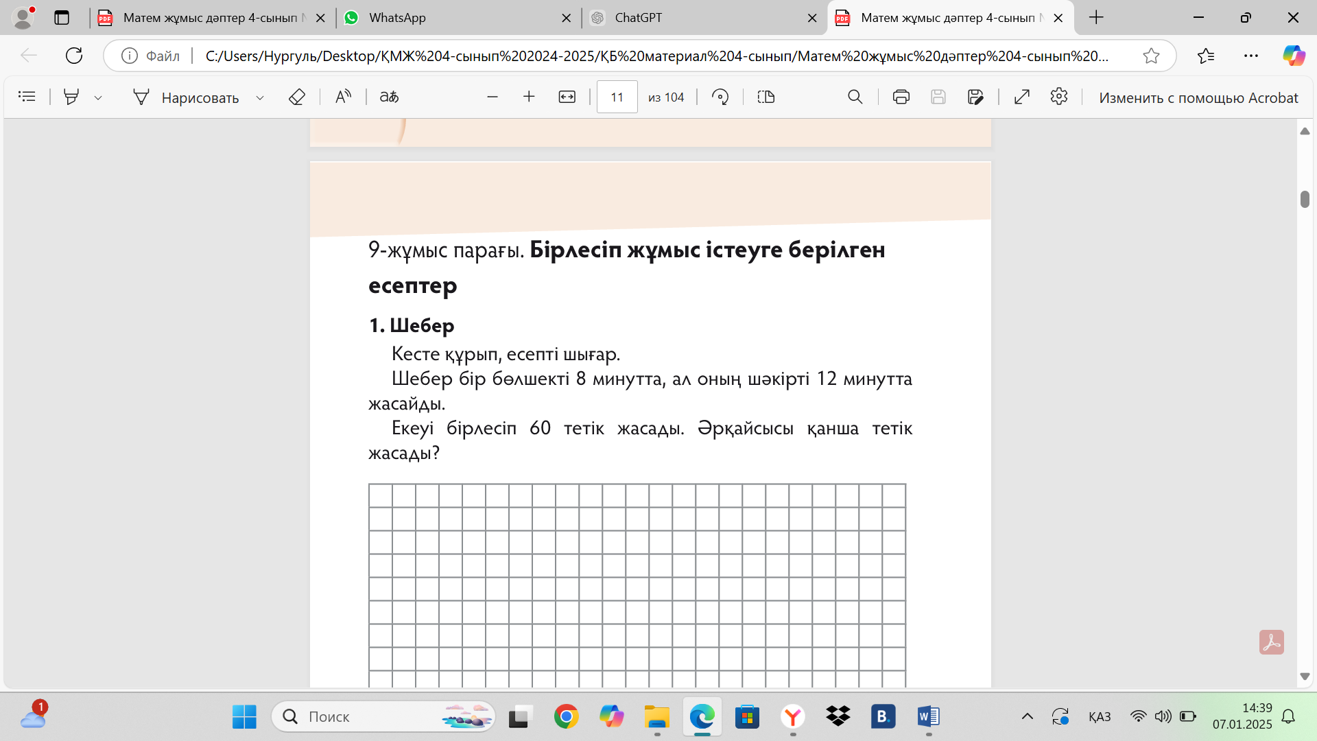 көмекші-? м , Өзіне қалды-3 қадам 1 қадам=1 метр Ш:1)7*3=21 м (барлығы) 10)9:3=3 м (V көш.) 2)21:7=3 м (I көм.) 11)9-3=6 м (қалды) 3)21-3=18 м (қалды) 12)6:2=3 м (VI көш) 4)18:6=3 м (II көм.) 13)6-3=3 м (қалды) 5)18-3=15 м (қалды) 6)15:5=3 м (III көм.) 7)15-3=12 м (қалды) 8)12:4=3 м (IV көм.) 9)12-3=9 м (қалды) Ж:Әрқайсысына 3 метрден тиді,өзіне де 3 м тиді,арықтың ұзындығы 21 қадам болған. |