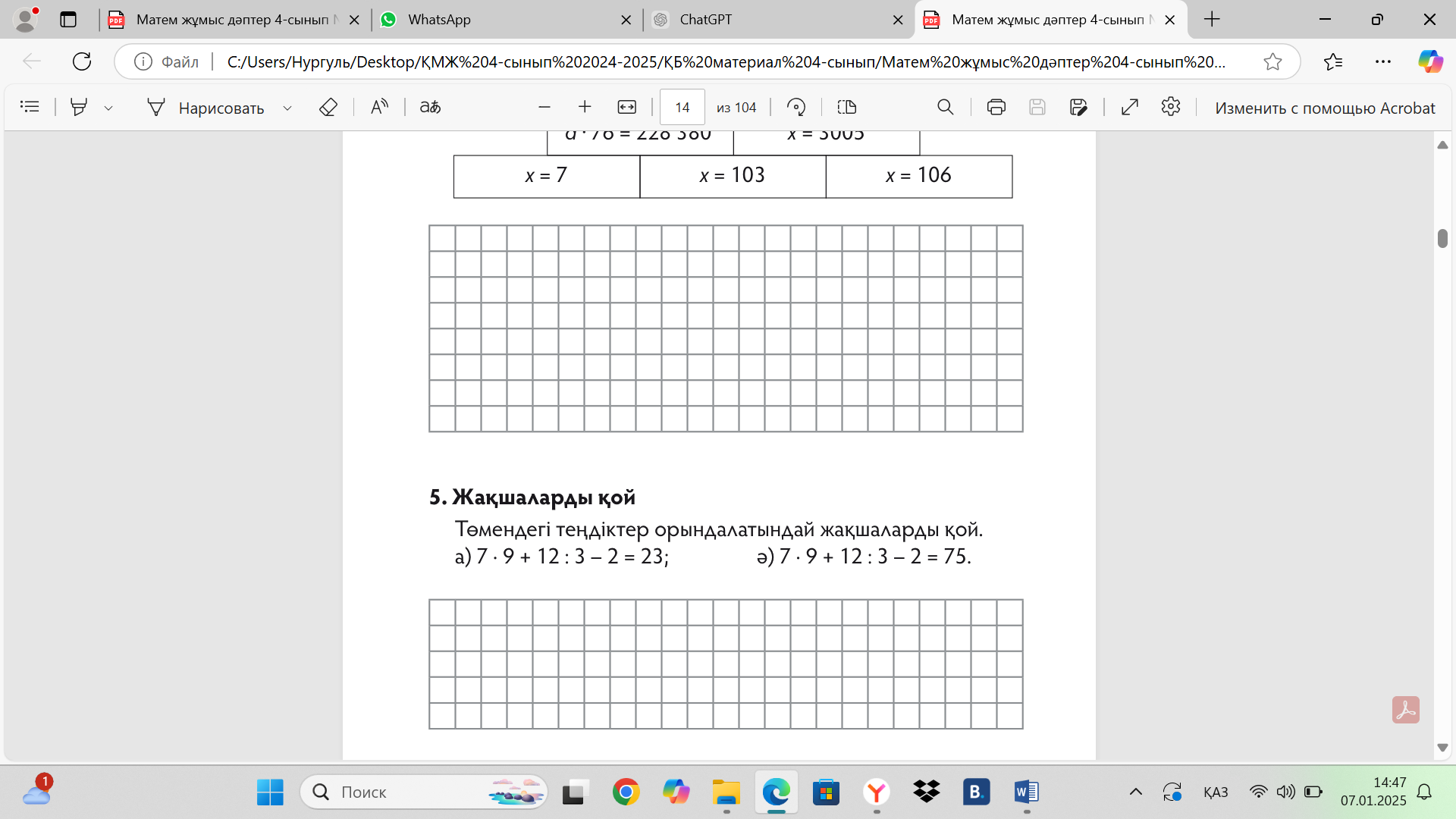 4-тапсырма. «Джигсо» әдісі бойынша №5 Есептерді шығар. А) алгебралық тәсілмен; Ә) арифметикалық тәсілмен а)М1=М2=480000г S1=700 түп S2=900 түп m-? г/ түп Ш:х-таңқурайдың түсімділігі болсын (т) S=700+900 М= S* m (700+900)*х=480000 1600*х=480000 х=480000:1600 х=300 г/ түп Ж:Таңқурайдың түсімділігі 300 г/ түп ә) m=70 кг/сотық М1=75 кг М2=135 кг S-? сотық Ш:1)М=М1+М2=75+135=210 кг 2) S=М: m=210:70=3 сотық Ж:Саяжай иесі 3 сотық жерге бүлдірген отырғызған. 5-тапсырма. Математика күнделікті өмірде №6 Есептің қай сұрағына жауапты әртүрлі тәсілмен алуға болады? m1=25 m\га m2=50 m\га S=30 га М M Ш:1)М1= m1* S=25*30=750 т (орташа күтім) 2)М2= m2* S=50*30=1500 т (жақсы күтім) 3) 1500:750=2 (есе артық) 4)1500-750=750 т (артық) Ж:Жақсы күтім жасалған кезде 2 есе артық қызылша немесе 750 т қызылша артық жинауға болады. 6-тапсырма. №7 Тиімді тәсілмен есепте 17*14+13*14=14*(17+13)=14*30=420 19*35+1*35=35*(19+1)=35*20=700 17*23-7*23=23*(17-7)=23*10=230 4*129-3*129=129*(4-3)=129*1=129 47*6-7*6=6*(47-7)=6*40=240 9*21-9*11=9*(21-11)=9*10=90