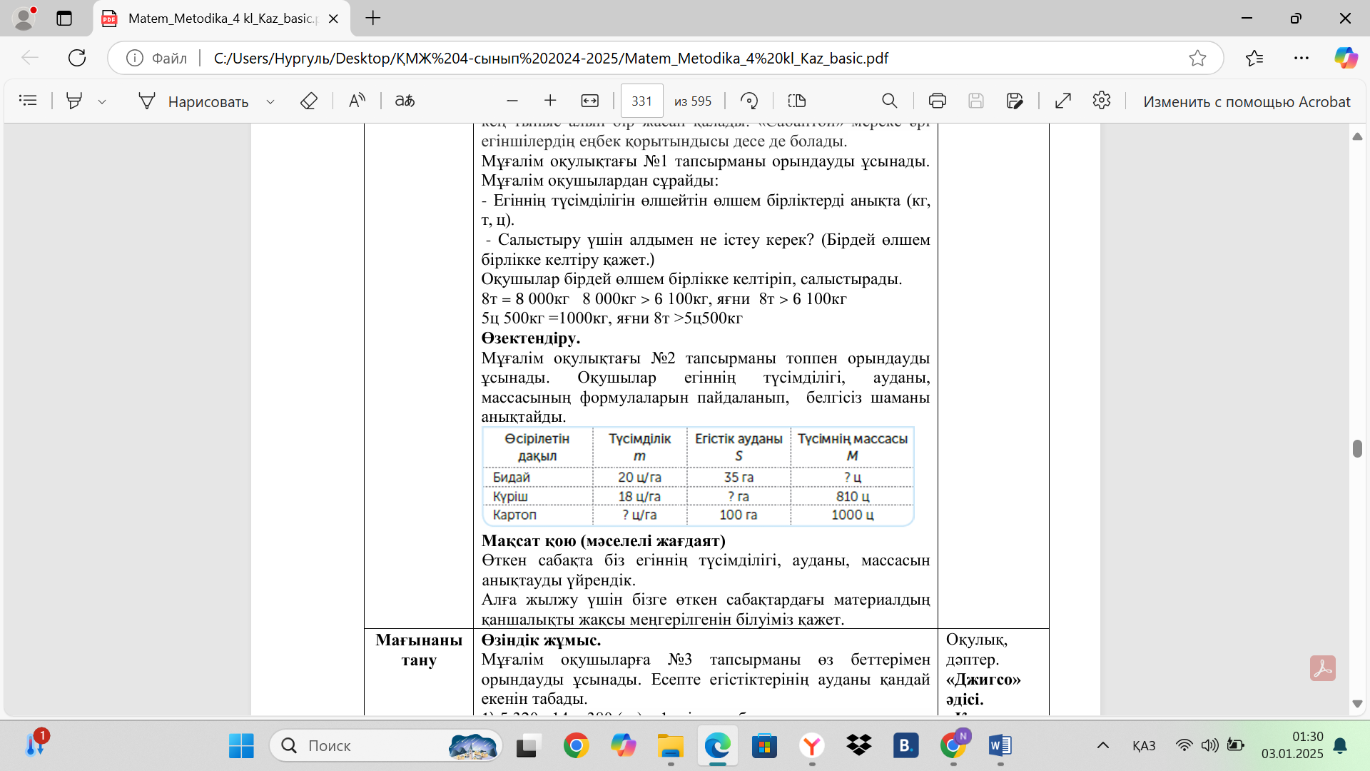 Оқушылар бірдей өлшем бірлікке келтіріп, салыстырады. Оқушылар егіннің түсімділігі, ауданы, массасының формулаларын пайдаланып, белгісіз шаманы анықтайды. Есептеп, егістіктерінің ауданы қандай екенін табады. Берілген есепті алдымен өздері шығарып алып, топ ішінде талқылап, әртүрлі тәсілдермен топтық жұмыс жасайды. Басқа топтарға өкілдерді жіберіп, өз жұмысы туралы топта талқылайды, идеялармен бөліседі.