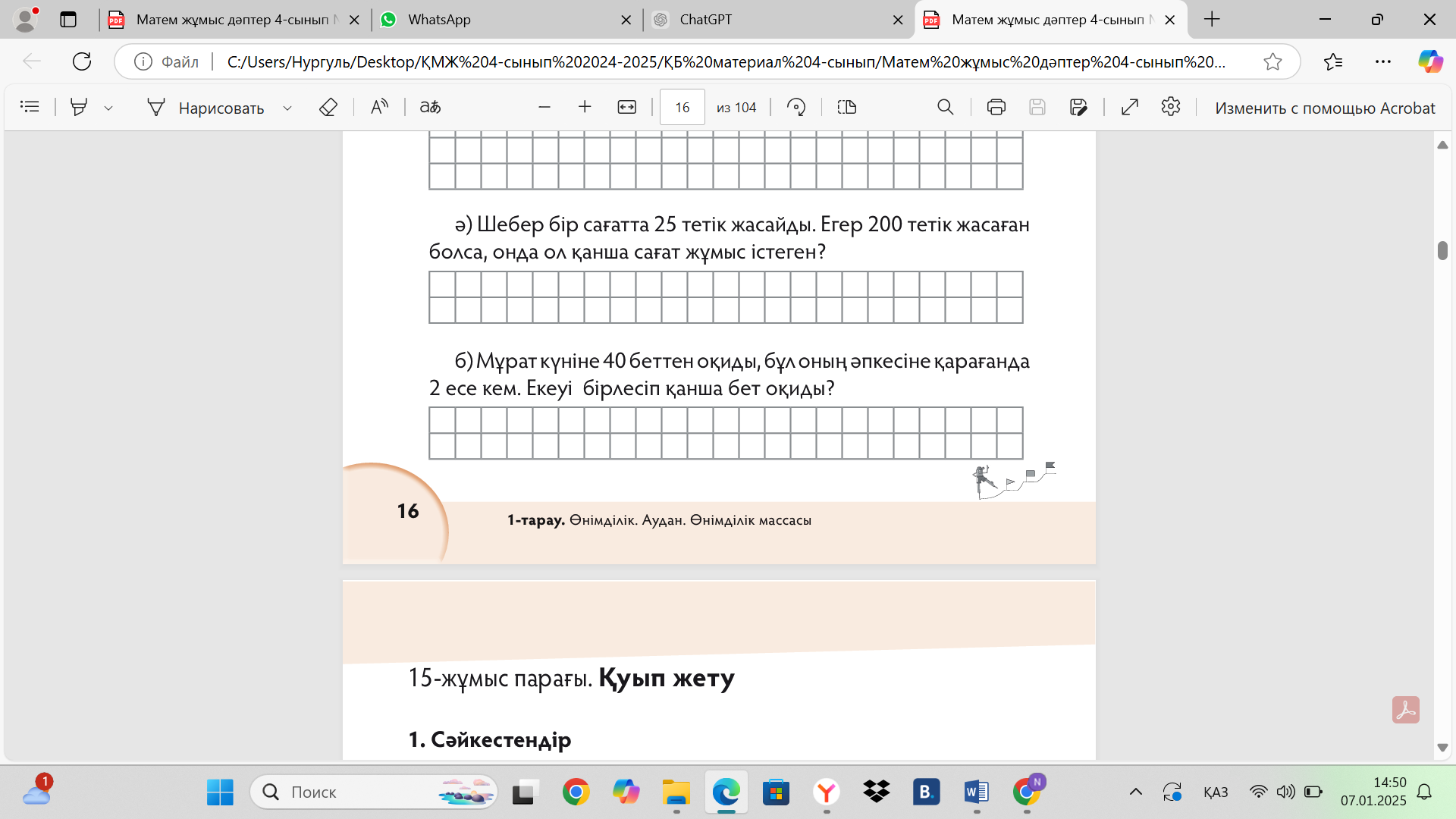 №11 m1=18 ц/га m2=8 ц/га S=300 га М1-? ц M2-? ц Ш:1) М1= m1* S=18*300=5400 ц (мол) 2) M2= m2* S=8*300=2400 ц (аз) Ж:Түсім мол болған жылы 5400 ц, аз болған жылы 2400 ц түсім алынды. |