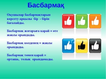 Бағалау – оқушы білімін тексеруді қалай жоспарлайсыз? Өзара бағалау және мұғалімнің бақылауы арқылы бағаланады Мадақтау, «Бас бармақ», «Бағдаршам», қол шапалақтау, смайликтер. |