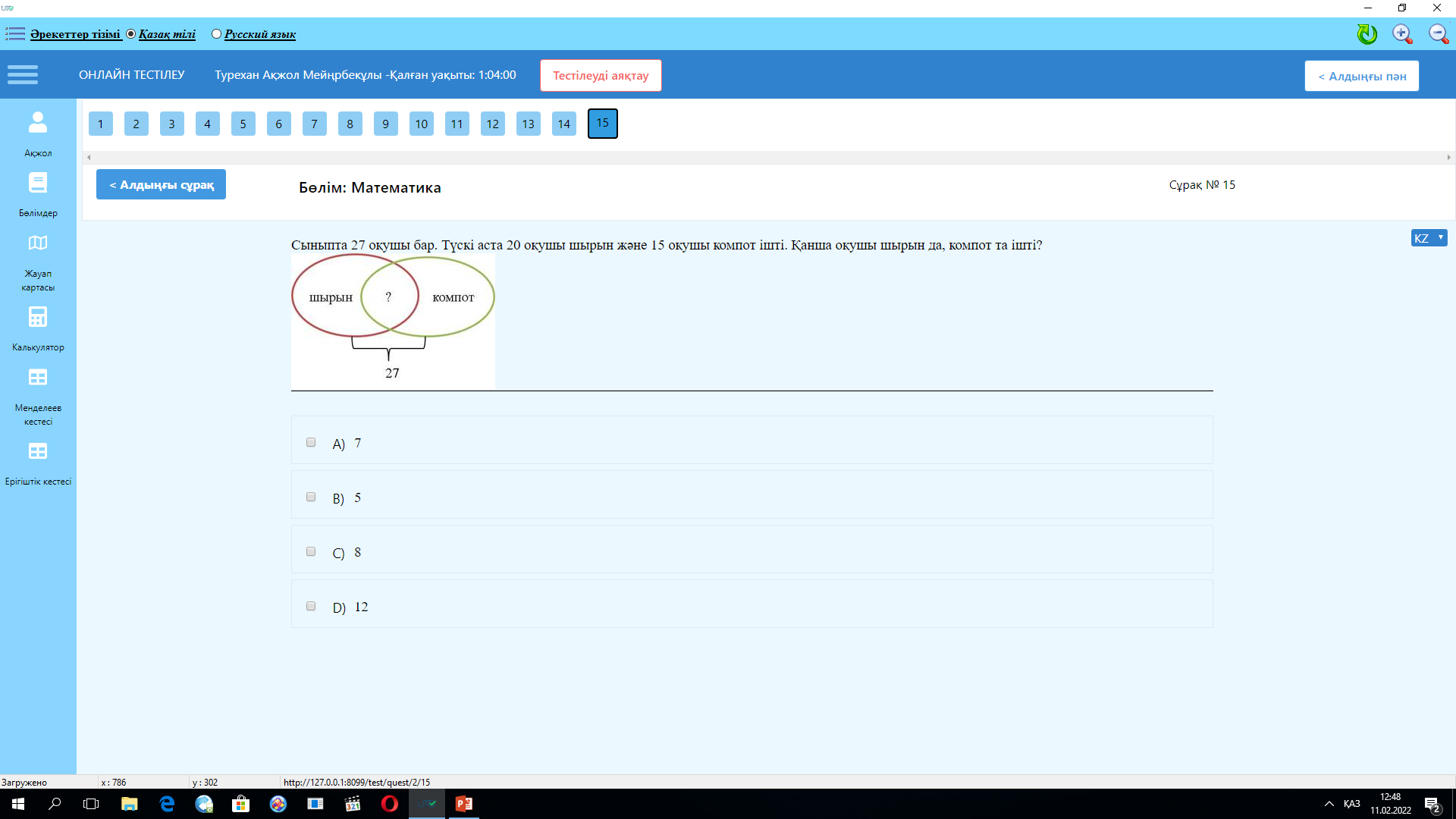 15. Сыныпта 27 оқушы бар. Түскі аста 20 оқушы шырын және 15 оқушы компот ішті. Қанша оқушы шырын да, компот та ішті?