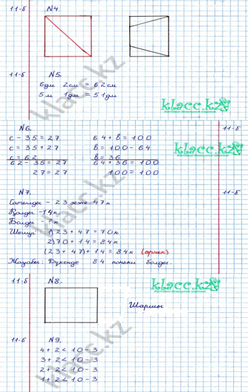 №5 .Түрлендір 6дм2см=62см 5м1дм=51дм №6.Теңдеулерді шеш С-35=27 64+в=100 с=35+27 в=100-64 с=62 в=36 ЕБҚ Тапсырманы орындауда қолдау көрсетіледі Шығармашылық тапсырма №7.Кесте бойынша есеп құрастыр және оны шығар Ш: ( 23+47)+14=70+14=84 коньки Ж: 84коньки болды