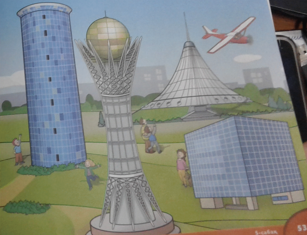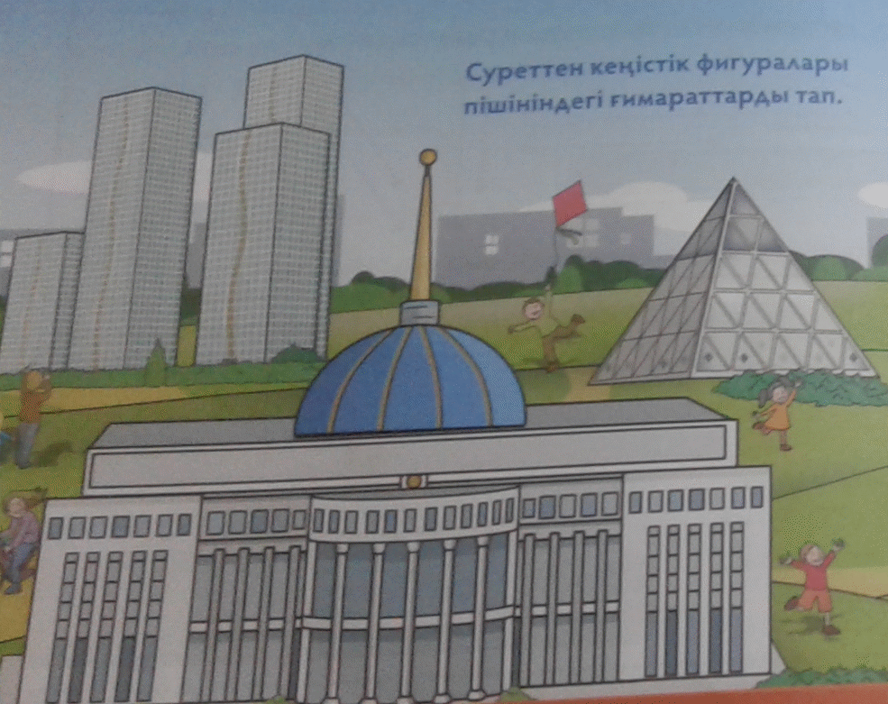 (С) Суретпен жұмыс. Суреттен кеңістік фигуралары пішініндегі ғимараттарды тап.