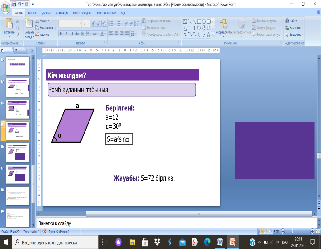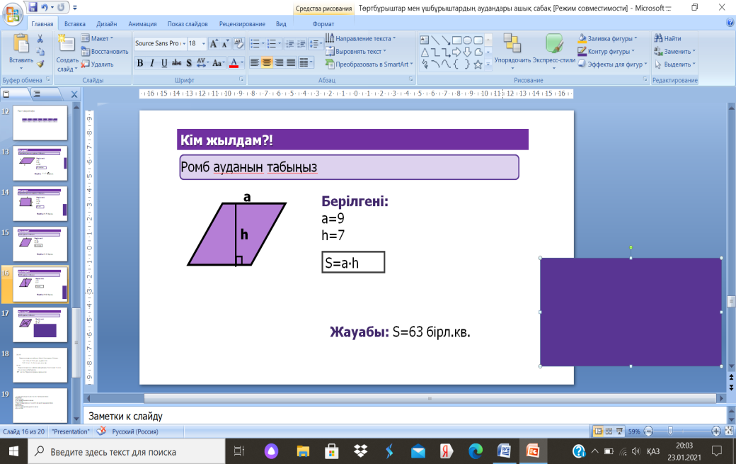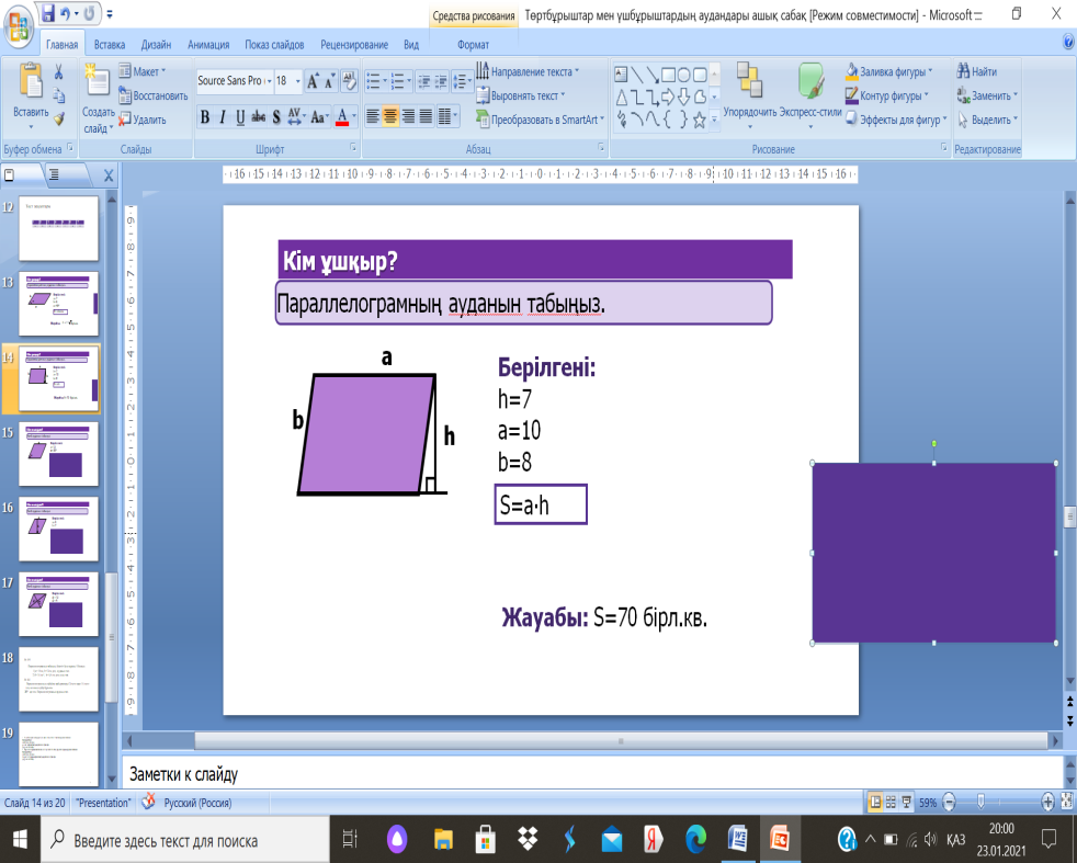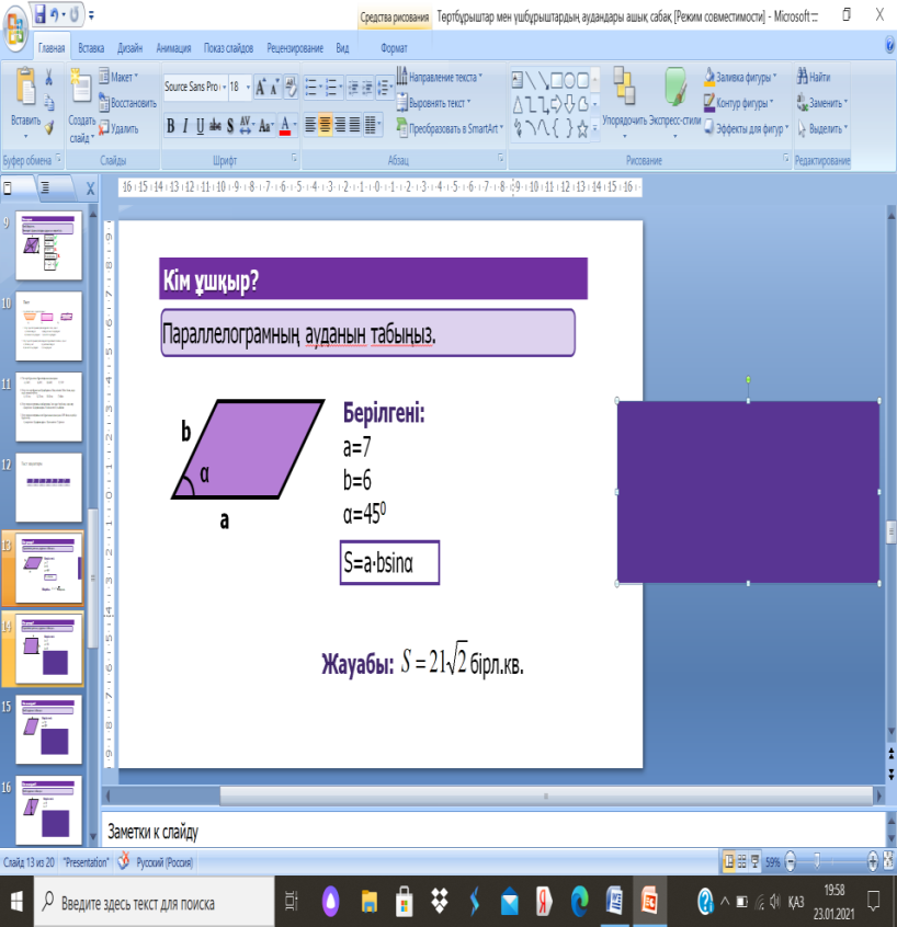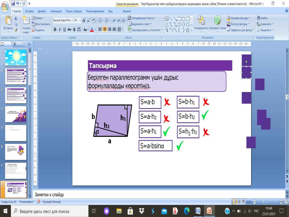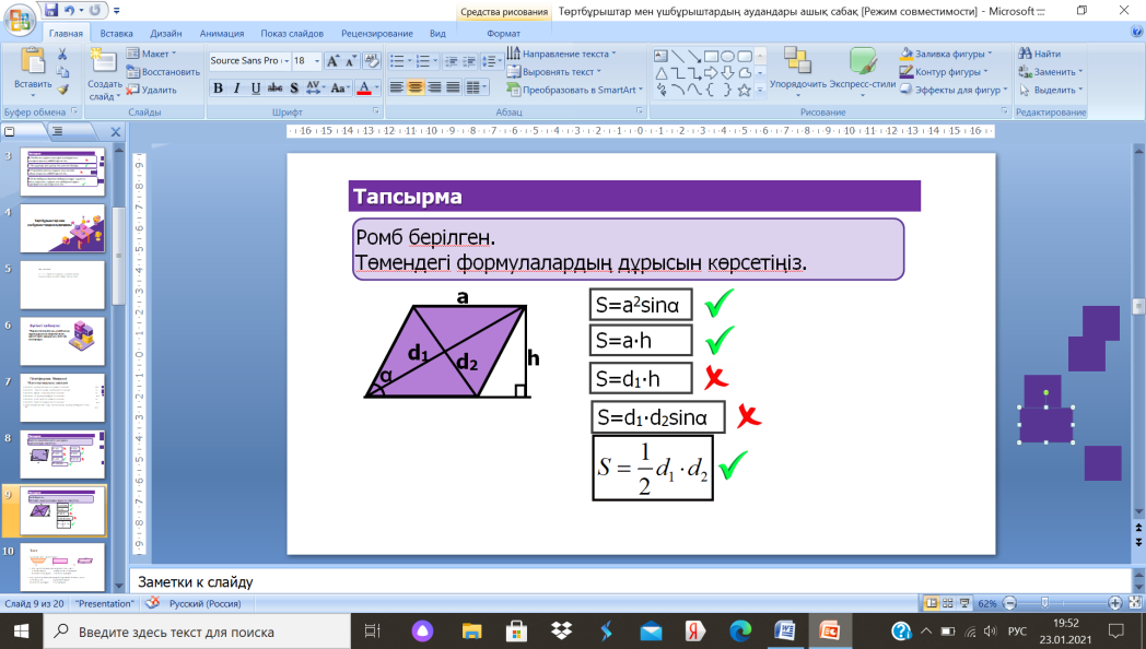 8.1.3.11параллелограммның, ромбтың ауданы формулаларын қорытып шығару және қолдану |