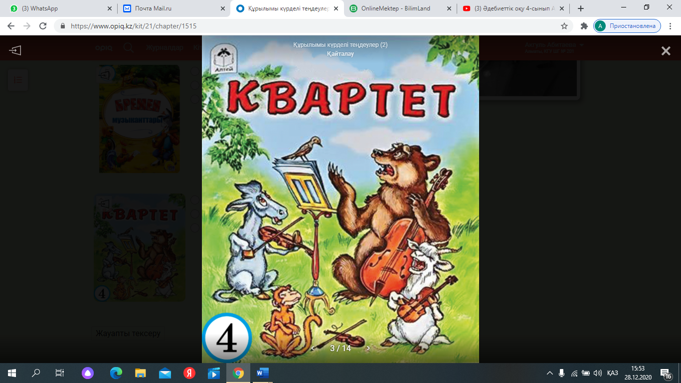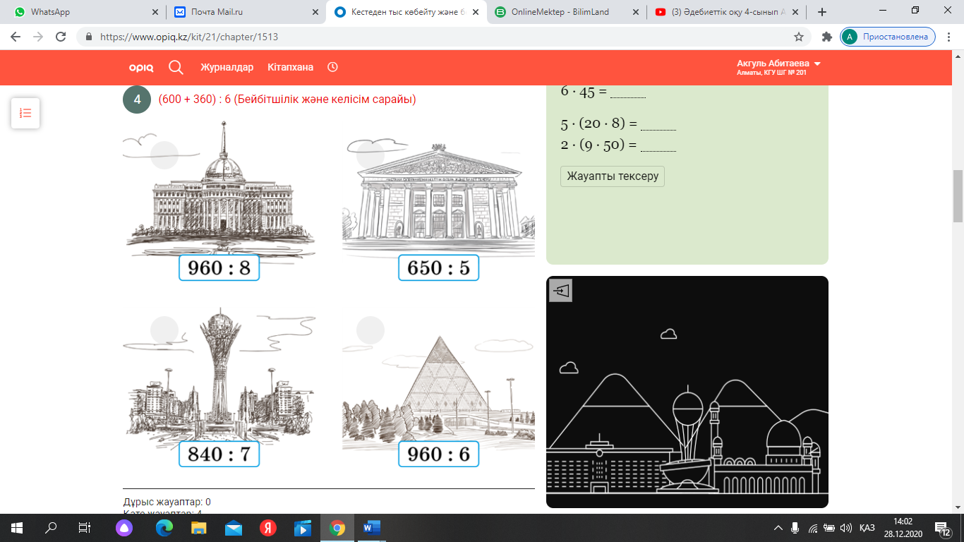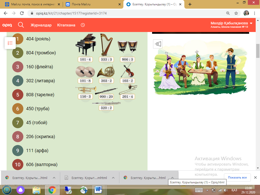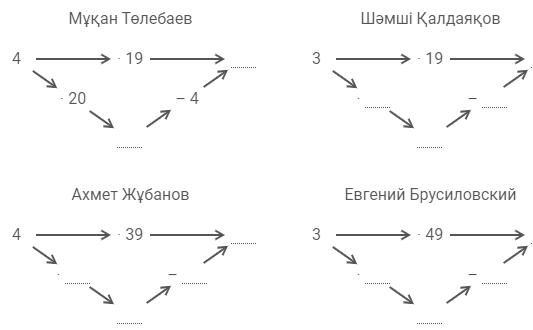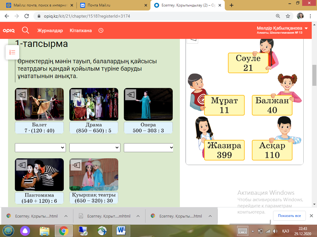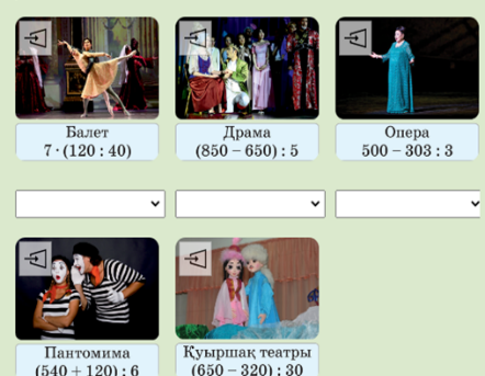 Дескриптор: Өрнектердің мәндерін дұрыс табады 2. Жазушылардың шығармаларын анықтайды. 3. Әдебиеттік оқу пәнінен өткен жазушылар шығармаларын атайды