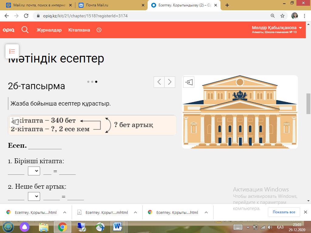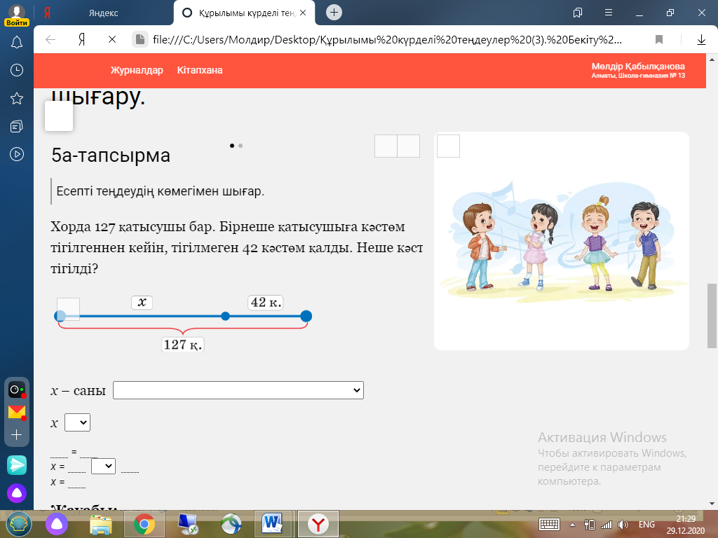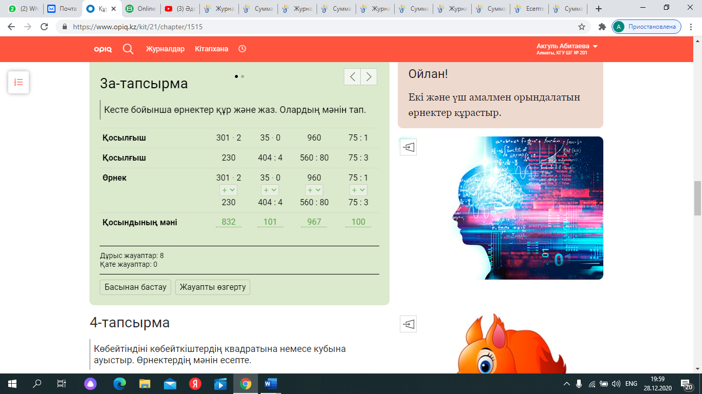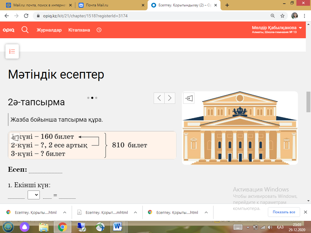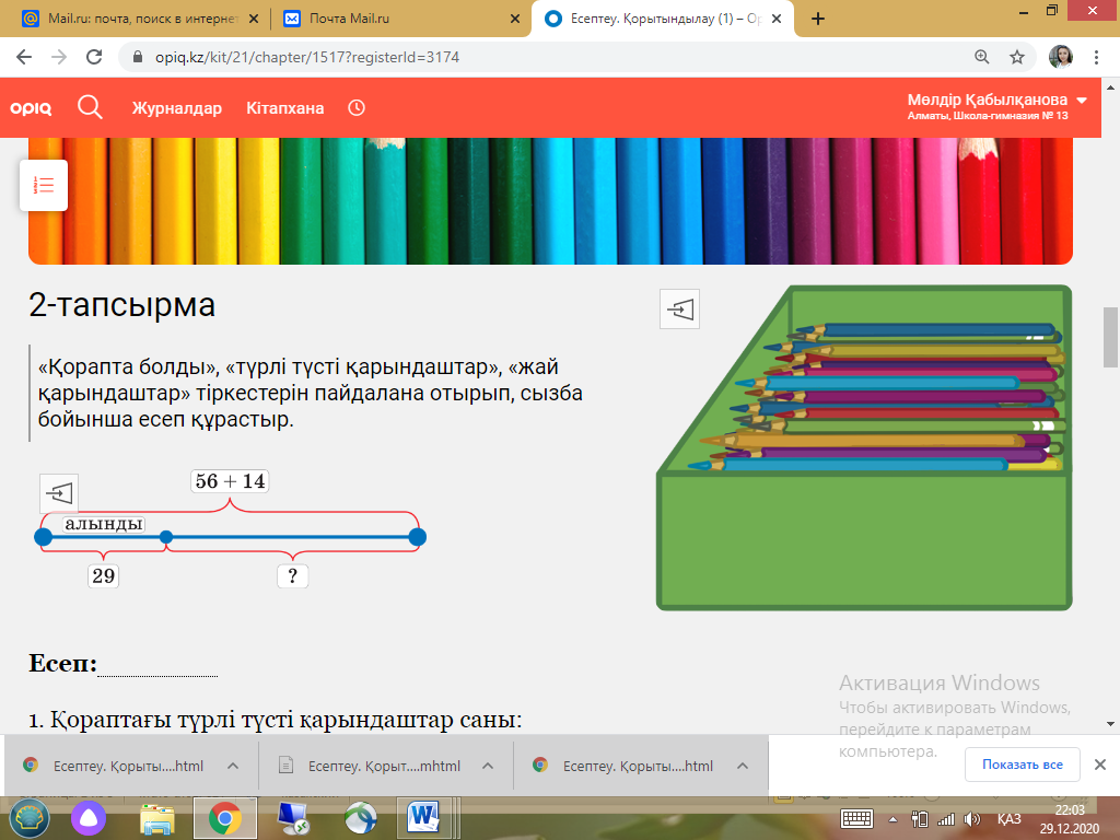 2-тапсырма..Білім алушылар берілген өрнек бойынша есеп құрастырып,мәнін табады. |