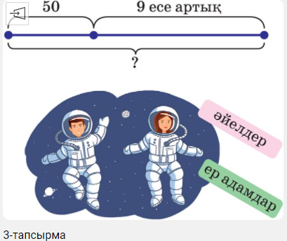 Дескриптор: 1.Есептің шартын жазады. 2.Сұрағын қояды 3.Өрнек құрады. 4.Жауабын табады ҚБ: Отшашу арқылы бір-бірін бағалау.