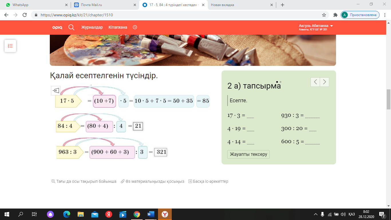 1-тапсырмадағы Көбейтудің қасиеттерінің әріптермен таңбалануына қара және өз мысалдарыңмен түсіндір. Тиімді есептеу үшін көбейту мен бөлудің қасиеттері қолданылады.