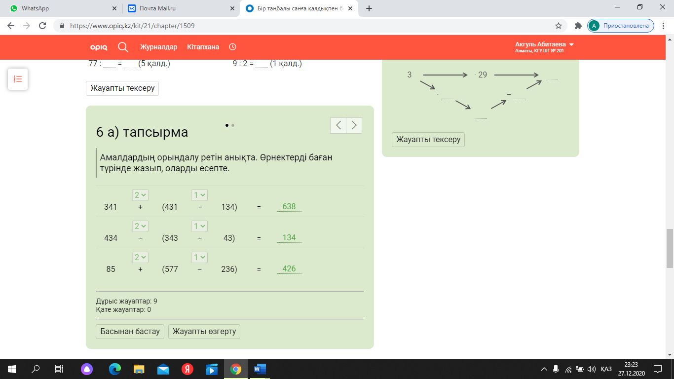 Дескриптор: 1.Өрнектің мәнін табады 2.Дұрыстығын тексереді. ҚБ: Отшашу арқылы бір-бірін бағалау.