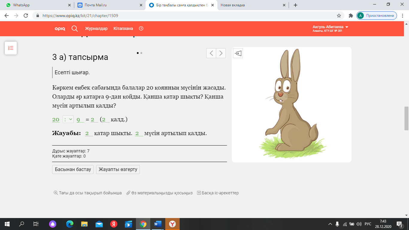 Ш: 16:4=4 16+4=20 Ж:барлығы 20 орын бар. |