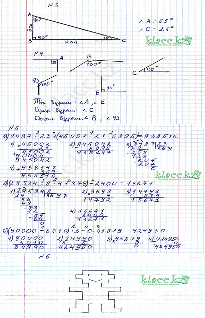Д 250 Е 999 Тік бұрыш: <A.<E Сүйір бұрыш: <C Доғал бұрыш: <B.<Д 5-тапсырма 3 4 1 2 А) 8487/23+(45002*21-6895)=938516 1 2 3 4 (29584/8*4+879)-2400=13271 1 2 4 3 (90000-5010)*5-0*45879=424950 ЕБҚ-тапсырма 6-тапсырма
