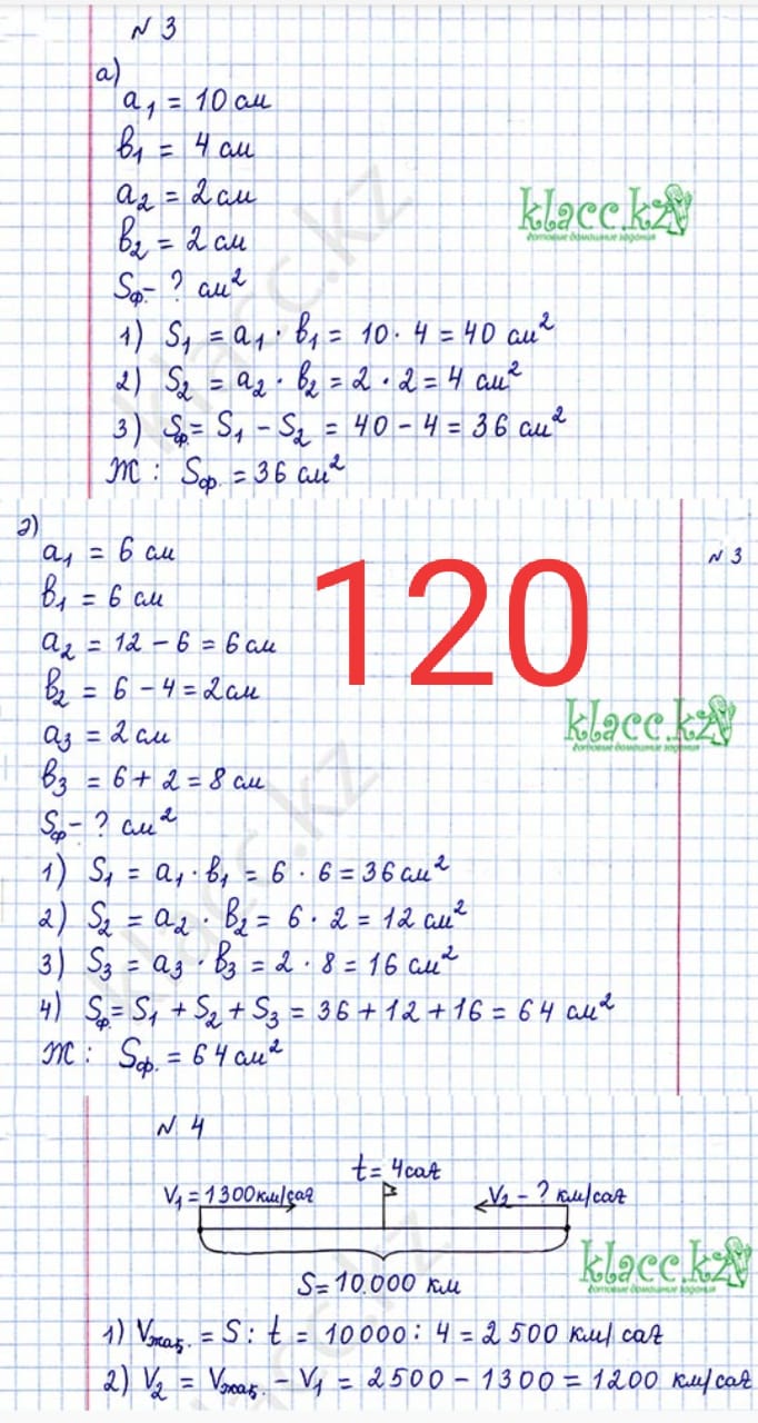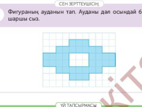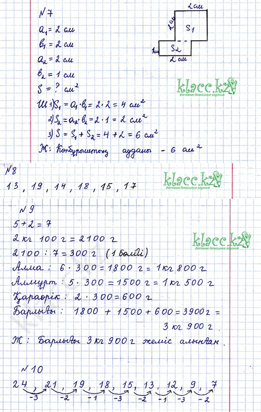Ә)V1=5км\сағ V2=4 км\сағ t=5сағ S=?км V=V1+V2=5+4=9км\сағ S=V*t=9*5=45км Өрнек: (5+4)*5=45км Ж: 5сағаттан кейін бір-бірінен 45 км қашықтықта болады. 6-тапсырма Берілгені қате.Сондықтан есеп шықпайды. ЕҚБ-тапсырма 7-тапсырма a1=2см b1=2см a2=2см b2=1см S=?см2 S1=a1*b1=2*2=4см2 S2=a2*b2=2*1=2см2 S=S1+S2=4+2=6см2 Ж: Көпбұрыштың ауданы -6см2 ЕБҚ-тапсырма 8-тапсырма 13,19,14,18,15,17. 9-тапсырма 5+2=7 2кг100г=2100г Алма: 6*300=1800г=1кг800г Алмұрт: 5*300=1500г=1кг 500г Қараөрік: 2*300=600г Барлығы: 1800г+1500г+600г=3900г=3кг900г Жауабы: Барлығы 3кг 900г жеміс алынған Үй тапсырмасы 10-тапсырма