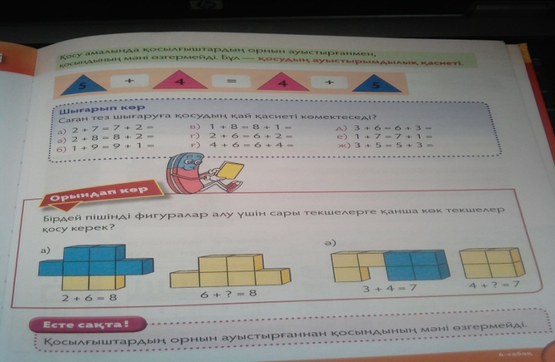 балықтардың жұбын тауып сызықпен қосыңыз. Қосудың ауыстырымдылық қасиетін негізінде балық жұбын анықтайды. 2. Тапсырма «Көршіңмен сырлас» әдісі бойынша шығарып көр.Жұппен жұмыс а)2+7=7+2=ә)2+8=8+2=б)1+9=9+1= в)1+8=8+1=г)2+6=6+2=ғ)4+6=6+4= А)3+6=6+3=е)1+7=7+1=ж)3+5=5+3= 3.Тапсырма «Ойлан тап» ойыны арқылы шешуін тап. 1.4+2=6 2+…=6 3+6=9 6+…= 9 2. 5+3= …. 7+2= ….