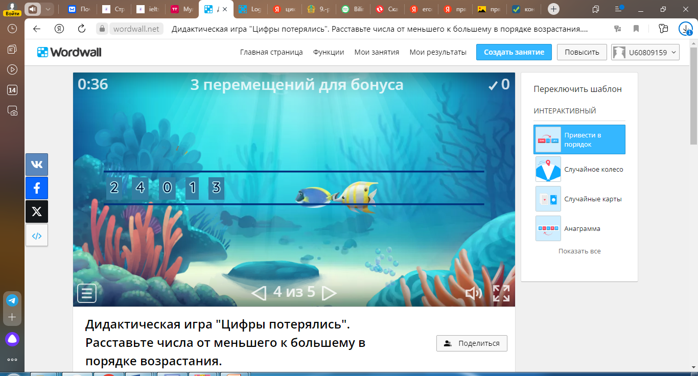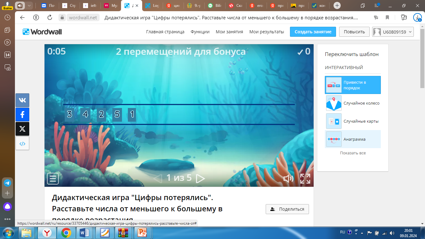 - Ребята, а теперь нам предстоит погрузиться на дно океана и увидеть удивительный подводный мир, чтобы выполнить задания. Дидактическая игра "Цифры потерялись" (слайд 13). Расставьте числа от меньшего к большему в порядке возрастания. Правильные ответы: