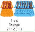 ФС 2,3 –тапсырма Топтық жұмыс ОДД:білу,түсіну,қолдану «Ойлан,жұптас» әдісі Нұсқау Суреттер бойынша теңдіктер мен теңсіздіктер құр. жалпы екі суретте: қыздардың ұлттық киімдері - 3 ұлдардың ұлттық киімдері – 6 Оларды салыстырайық. 3<6 бірінші суретте: қыздардың ұлттық киімдері - 2 ұлдардың ұлттық киімдері – 2 2=2 екінші суретте: қыздардың ұлттық киімдері – 1 ұлдардың ұлттық киімдері – 4 1<4 Енді екі суретті салыстырайық. бірінші суретте -4 екінші суретте -5 2+2<5 4<4+1 Әріпті өрнектерді салыстыр. Оларды түсіндір. a+2>a a-3<a a<a+2 a>a-3 ЕББҚ ететін (ойлау деңгейі төмен ) балаға тапсырма Әріптің орнына сандарды қояды |