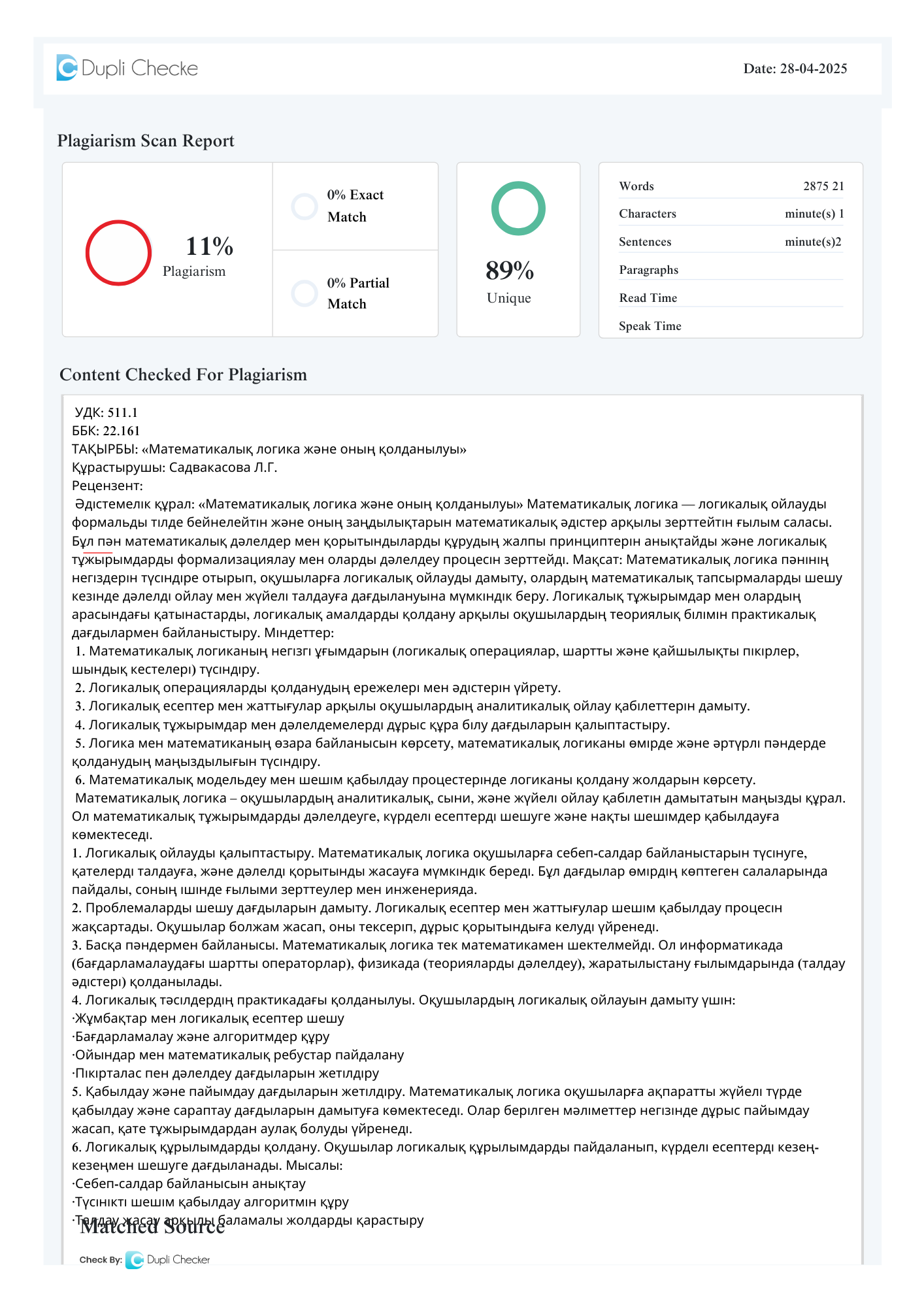 Әдістемелік құрал бірнеше бөлімнен тұрады: математикалық логиканың негізгі ұғымдары, логикалық амалдар мен олардың қасиеттері, қарапайым және күрделі логикалық формулалар, пропозициялық және предикаттық логика негіздері, ақиқаттық кестелер, Булев алгебра элементтері қарастырылған. Сонымен қатар, логиканың білім беру мен басқа ғылым салаларымен байланысы, практикалық қолданыстары нақты мысалдармен көрсетілген. Құралда ұсынылған теориялық материалдармен қатар, практикалық жаттығулар мен есептер жинағы оқушылардың логикалық ойлауын қалыптастырып, оны қолданбалы деңгейде дамытуға мүмкіндік береді. «Математикалық логика және оның қолданылуы» оқу-әдістемелік құралы оқушылар мен мұғалімдер үшін құнды ресурс болып табылады. Ол математикалық логика негіздерін меңгеруге, логикалық ойлау қабілетін жетілдіруге және білімді практикада қолдануға үлкен мүмкіндік береді. Құрал орта буын және жоғары сынып оқушыларына, сондай-ақ педагогтарға қолдануға ұсынылады.