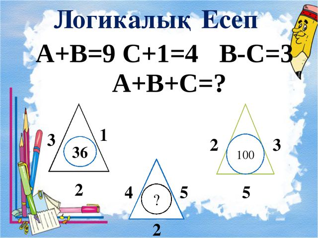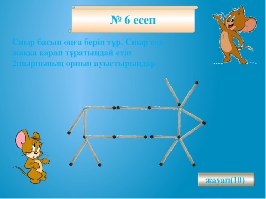 ауыр ма? (тең) 7. Үстел беті төрт бұрыш, оның бір бұрышын кесіп алсақ, неше бұрыш қалады?(5) 8. 5 жыл бұрын Ержан 3 жаста болған. Қазір Ержан неше жаста?