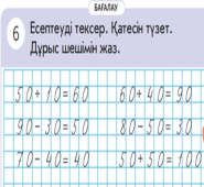 3-тапсырма Есептеуді тексер. Қатесін түзет. Дұрыс шешімін жаз 50+10=60 60+40=100 90-30=60 80-50=30 70-40=30 50+50=100