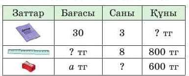Бағалау критерийі: Есептерді шығару барысында баға, мөлшер (сан), құн арасындағы тәуелділігін пайдаланады Дескриптор: Кестенің әр бағанындағы белгісізді табу үшін өрнек құрады.3 балл