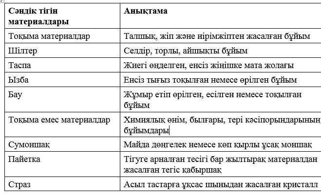 Тігін бұйымын сәндеу, эстетикалық сапасын арттыру үшін әртүрлі сәнді тігін материалдарды қолданады. Олар дайындалатын шикізаттың өлшемімен, пішімімен және түсімен ерекшеленеді. Тігін бұйымын әшекейлеуде әртүрлі фурнитуралар қолданады. Фурнитура – киімді түймелеу, бекіту, сәндеу үшін қолданылатын құралдар. Тігін фурнитурасына түйме, сыдырма, ілгек пен түймелік, батырма, т.б. Дәптермен жұмыс. Дәптерге кестеде көрсетілген тігін бұйымдарын сәндеуге арналған материалдарды көшіру. (47бет)