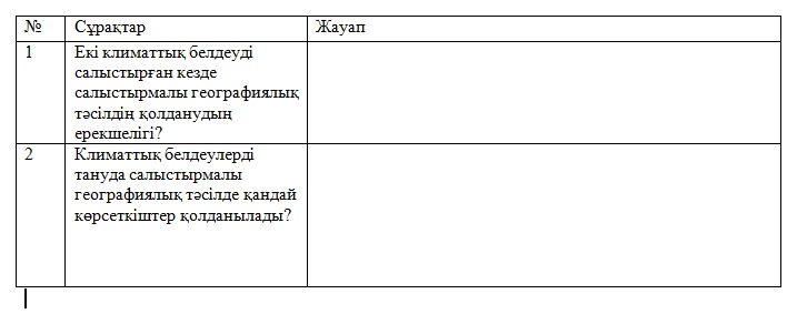 Дескриптор: 1.Оқулықтың мәтінін оқиды 2. Ұқсас климаттық белдеулерді анықтайды 3. кестеге толтырады Әр дұрыс жауапқа 2 ұпай |
