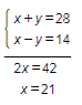 5тапсырма Екі санның қосындысы 28, ал олардың айырмашылығы 14. Бұл сандарды табыңыз. Шешім: бірінші Сан болсын - х; екінші-у, содан кейін
