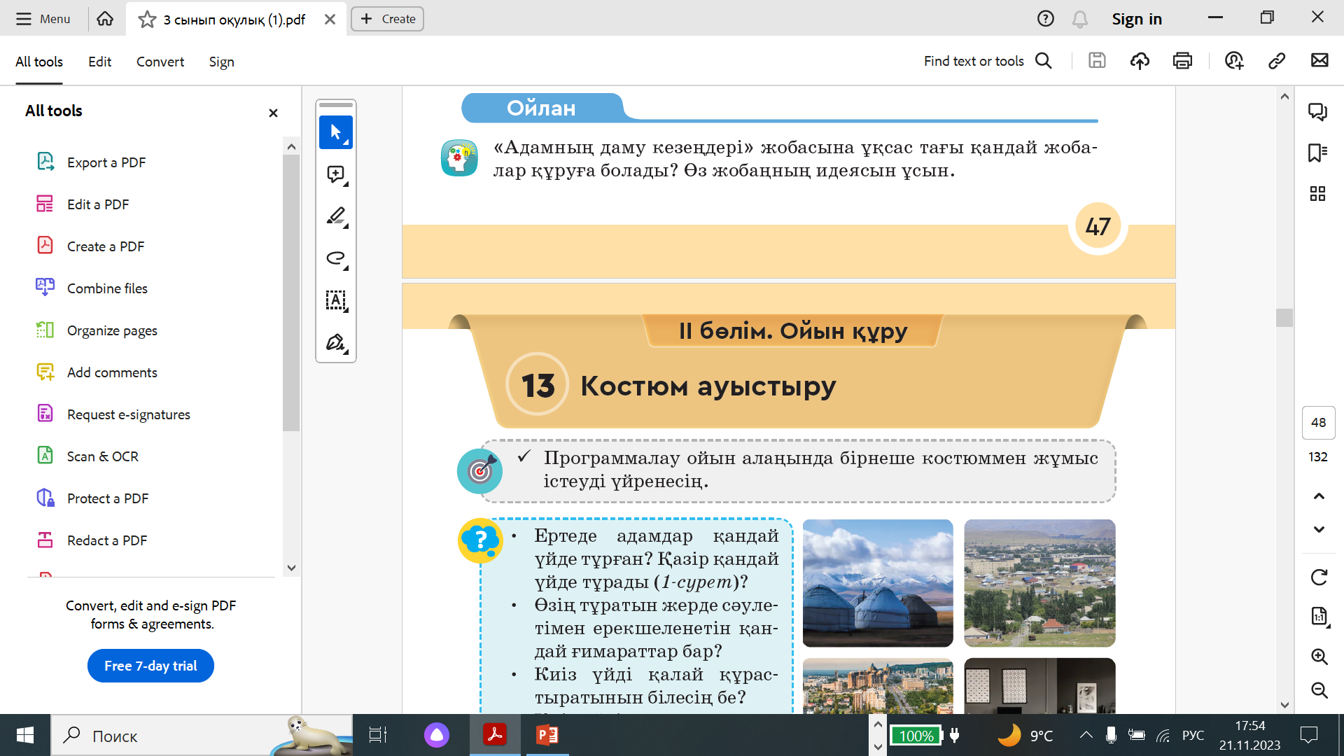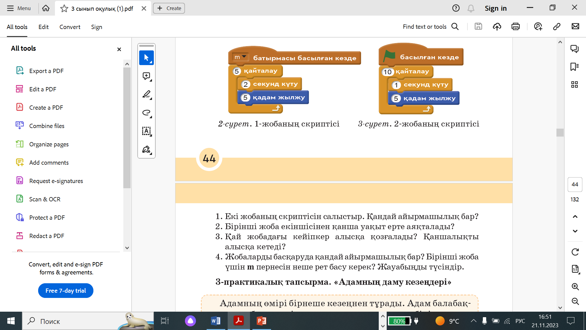 1 тапсырма Scratch программалау ортасында көрініске жаңа фон кірістіру үшін, 1-суреттегі 1, 2, 3 және 4-батырмалар қолданылады. а) Осы батырмалардың әрқайсысының қызметін анықтап, жаз. ә) Көрініске интернеттен алынған фонды қою үшін, 1-суреттегі қай батырманы қолданамыз? б) Жобада қолданылатын фонның бірін фондар кітапханасынан алып, екіншісін қолмен салу керек болса, қай батырмалар қолданылады? 2-тапсырма Мысық кейіпкердің қозғалысын сипаттайтын екі жобаның скриптісі берілген (2, 3-суреттер). Осы жобаларды төмендегі сұрақтар бойынша салыстыр. Екі жобаның скриптісін салыстыр. Қандай айырмашылық бар? 2. Бірінші жоба екіншісінен қанша уақыт ерте аяқталады? 3. Қай жобадағы кейіпкер алысқа қозғалады? Қаншалықты алысқа кетеді? 4. Жобаларды басқаруда қандай айырмашылық бар? Бірінші жоба үшін m пернесін неше рет басу керек? Жауабыңды түсіндір. Практикалық жұмыс Адамның өмірі бірнеше кезеңнен тұрады. Адам балабақшада тәрбиеленеді, мектепте, университетте білім алады, сонан соң жұмыс істейді. Аталған кезеңдерде адам жан- жақты дамиды. Scratch-те «Адамның даму кезеңдері» деген тақырыптағы жоба жұмысын компьютерде орындайық. ЕББҚ ететін оқушыға арналған тапсырма Информатикалық диктант 1. Кейіпкер сөзі латын тілінде «persona» – «адам, тұлға» дегенді білдіреді. 2. Ойын құрастыру үшін, алдын ала дайын үлгі сценарий құрастырып алған жөн. 3. Кейіпкер көріністен сахнада қозғала алатындығымен ерекшеленеді. |