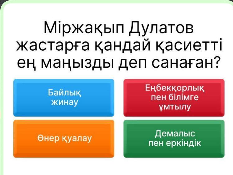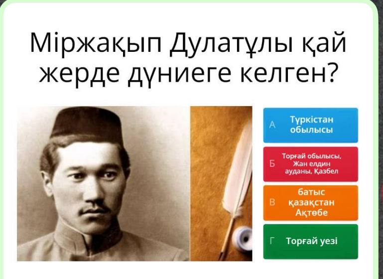 1-тапсырма. Оқушылар М.Дулатұлының өмірбаянына байланысты «wordwall» сайтында викториналық сұрақтарға жауап береді.