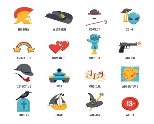 Movie genres vector icons. Movie film genres, comedy genre, war and romance genres, history drama film genre illustration |