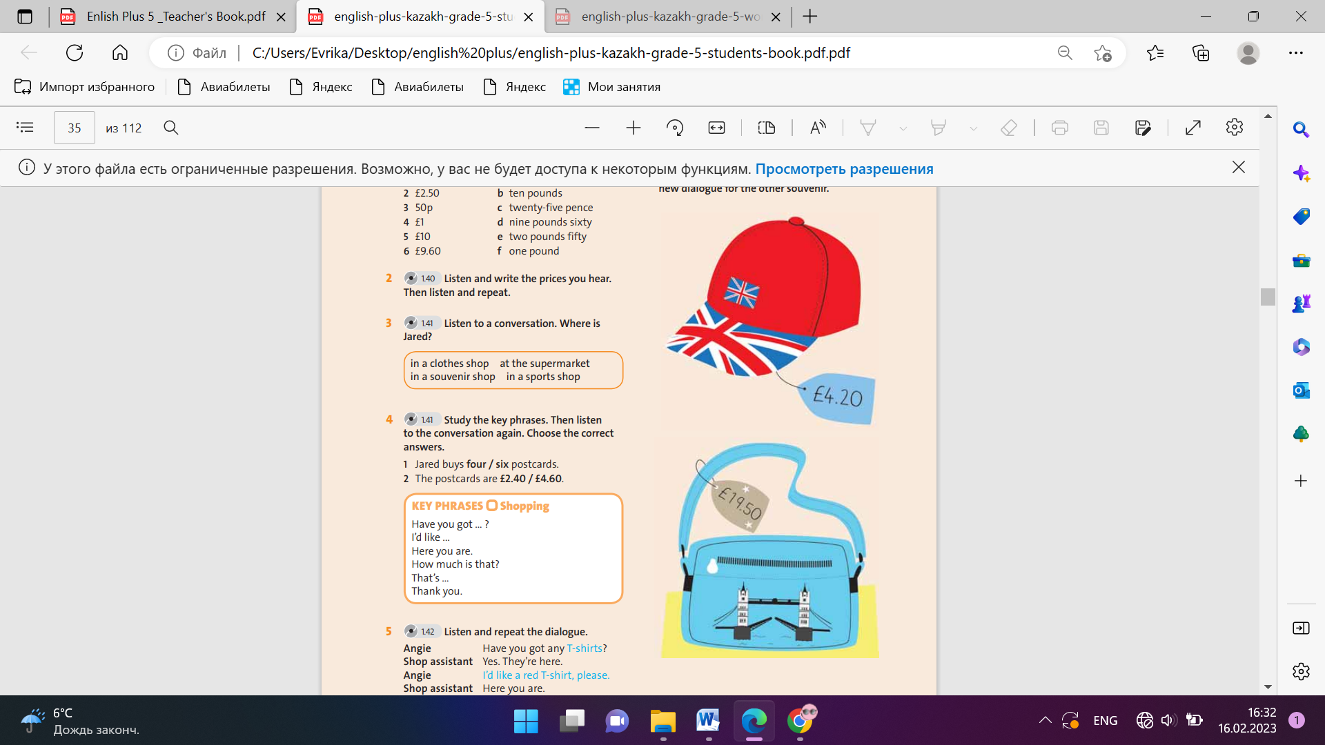 Ex: 1 P: 35 • Focus students’ attention on the two columns. Ask them what the currency symbol £ represents and elicit that it represents pounds, the currency used in the UK. Point out that there are 100 pence in one pound. If you can, tell students how much £1 is worth in their currency. • Explain the task. Students complete it individually and check their answers in pairs. Check answers as a class. • Model the prices for pronunciation and ask students to repeat Differentiation: «Verbal support» method is used to help Students use new words in the text. Ex: 2 P:35 • Explain the task. Ask students to write the prices down in two ways (numbers and words). • Pause after each price to allow students time to write it down. • Students compare their prices in pairs. Check answers as a class. • Play the recording again and pause after each price to allow students time to repeat Ex: 3 P:35 • Explain the task and draw students’ attention to the question. Check they understand what the four different places are by quickly eliciting from the students some example of the different things you can buy in each. • Play the recording. Students check their answers in pairs. Check answers as a class. |